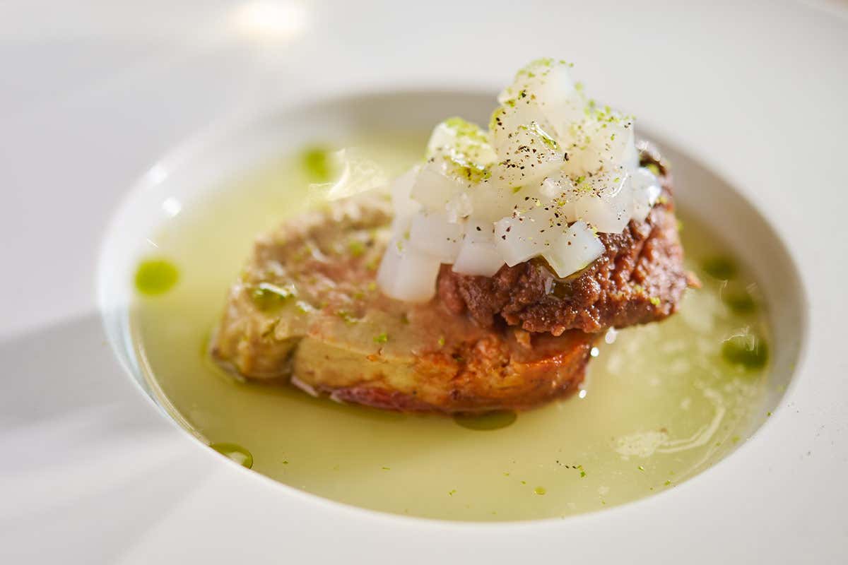 Avvolgere nella rete di maiale il fegato di rana pescatrice, cuocerlo sulla brace con l’alloro e poi scalopparlo. Raffreddare il succo di pera, correggerlo con il succo di lime e la sua zest, aggiustare di sale.