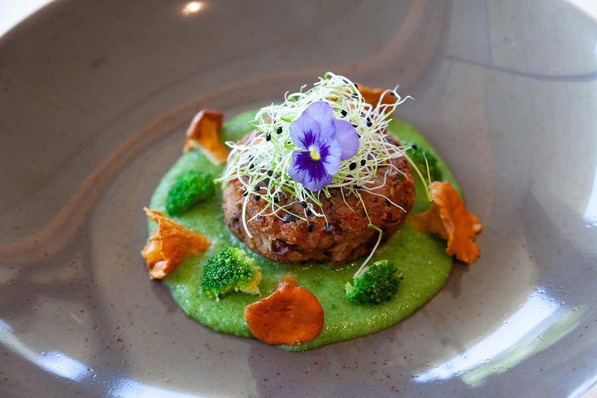La crema di broccoli, vellutata e delicata, avvolge il palato con note verdi e fresche, mentre i finferli saltati aggiungono profondità aromatica e una piacevole consistenza. Una proposta 100% plant-based che dimostra come la cucina vegana possa essere raffinata, completa e profondamente soddisfacente.