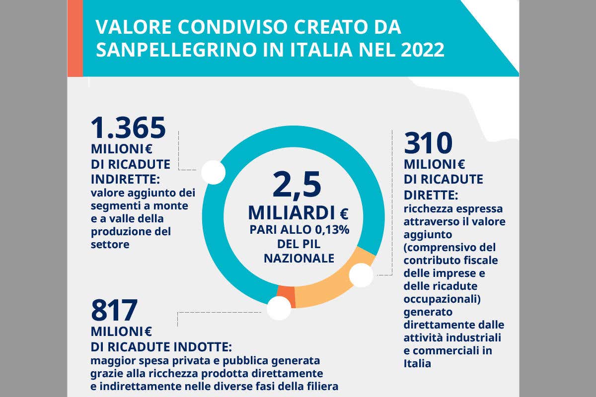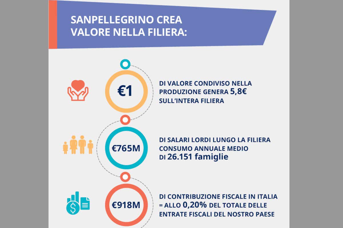 Secondo lo studio citato, il valore condiviso creato da Sanpellegrino corrisponde a quasi 3 volte il fatturato di gruppo e allo 0,13% del PIL nazionale. Questo valore generato corrisponde circa al 28% della produzione del comparto delle acque minerali, succhi e bevande analcoliche e al 2% della produzione dell’industria alimentare del Paese.