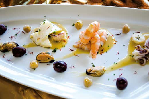 Ceci Grandi Cotti a Vapore e in vellutata con olio extravergine, polpo, seppia, gamberi e olive taggiasche