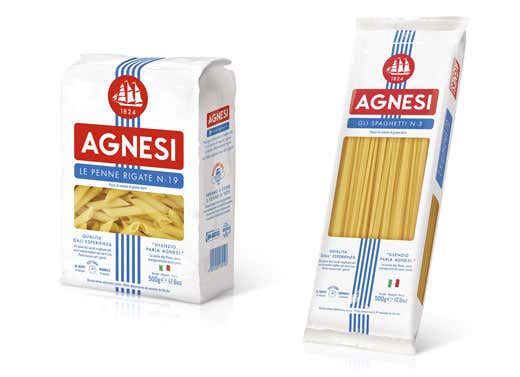 Da aprile il marchio sarà sugli scaffali con un nuovo packaging realizzato al termine di una gara che ha visto coinvolte diverse agenzie. La scelta che è risultata vincente è stata firmata da un designer inglese, e si ispira alla confezione degli anni ’50 di Agnesi reinterpretandola in chiave moderna. I colori sono: il bianco per lo sfondo a evocare la premiumness, il rosso che è il colore tradizionale del marchio e il blu che evoca le radici, il dna di Agnesi. Il logo è quello originale Agnesi degli anni ‘50 chiaro, razionale e moderno, ma allo stesso tempo caldo e coinvolgente; il veliero presente da sempre nelle confezioni di Agnesi diventa anch’esso stilizzato e moderno ed è posizionato all’interno di un bollo rosso che contiene anche l’indicazione del 1824, anno di nascita di Agnesi.