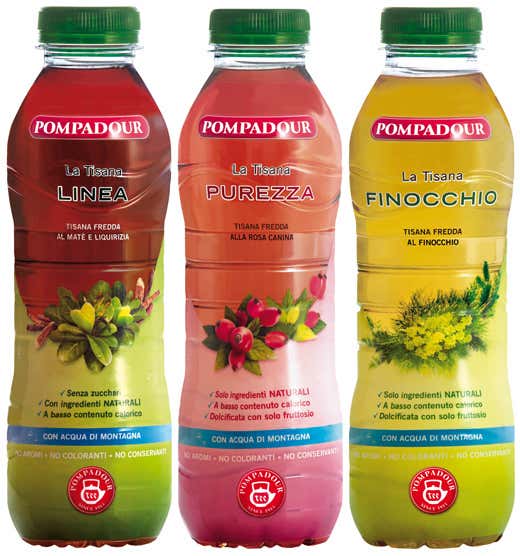 Tra le recenti novità per il canale Horeca e il vending è da segnalare il lancio delle Tisane Fredde Pompadour in acqua minerale di montagna, anche nel formato da 50 cl in Pet che si affianca al formato da 75 cl per il retail.