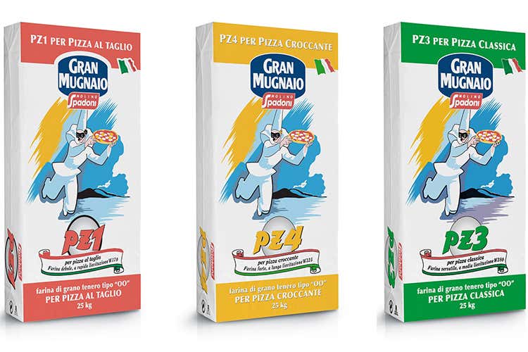 Farina per pizza croccante, PZ4, contraddistinta dal colore giallo. Farina di grano tenero tipo 00, a lievitazione lunga (da 12 a 20 ore), in confezioni da 5, 15 o 25 kg. Permette di ottenere una pizza friabile e profumata. Oltre alle PZ, Molino Spadoni propone anche la Farina tipo Manitoba di grano tenero tipo 0, a lunghissima lievitazione (24 ore), ricca di proteine e denominata “la regina delle farine” per le sue caratteristiche di lavorazione.