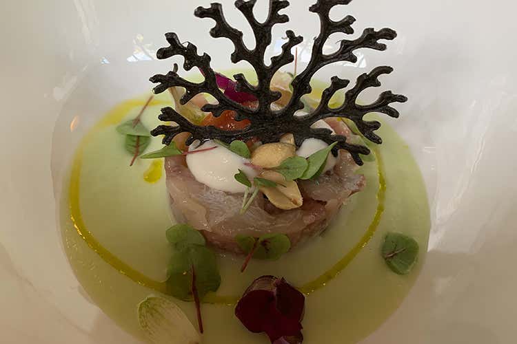 Nel menu a seguire, elaborato da Tommaso Arrigoni con alcuni oli degustati, Rasara ha completato la Tartare di ricciola, zuppetta di cetriolo, pomodori marinati all’extravergine e arachidi.