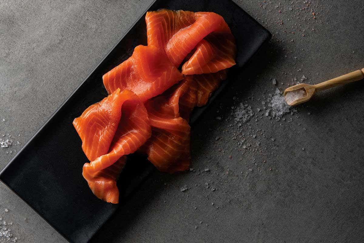• Ora King Salmon affumicato a freddo, sfilettato a mano e spinato, salato con sale marino e zucchero di canna, e affumicato lentamente a freddo con legno di manuka, originario della Nuova Zelanda.