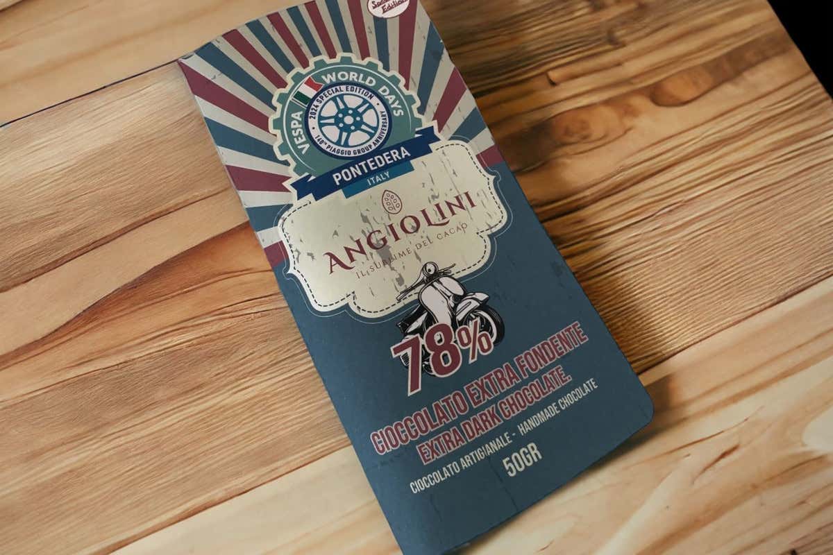 Questa tavoletta è nata quasi per gioco; un gioco riuscito talmente bene che si è potuta fregiare del logo ufficiale della manifestazione di cui è diventata la tavoletta di cioccolato ufficiale. Tanti i particolari distintivi anche nel packaging: dalla Vespa stilizzata alla carta che sembra sporca Angiolini ha «voluto ricordare che spesso i vespisti hanno le mani sporche d'olio che macchia terribilmente. Ad Angiolini piace fare ricerca nel suo settore personalizzando le sue creazioni. Un esempio? Per Natale Bulgari aveva chiesto per il proprio punto vendita di Firenze dei cioccolatini da offrire alla clientela ed io ho creato una pralina che riprende i suoi profumi».