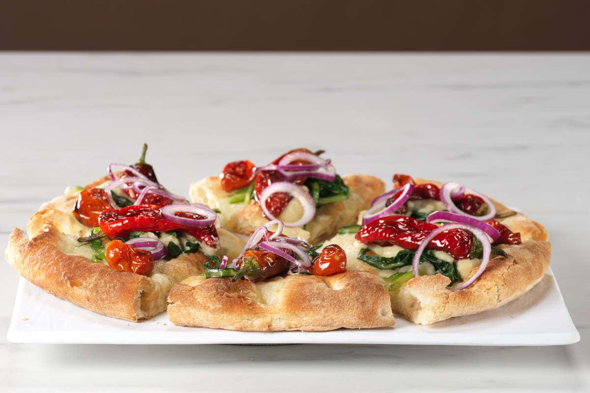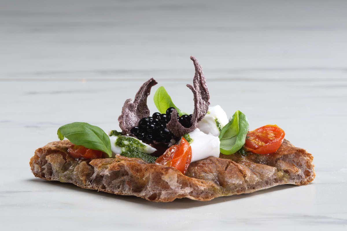 Poi ha distribuito la purea di fave con il cucchiaio. Nel frattempo ha tuffato brevemente in padella i friggitelli, che ha poi appoggiato su ogni spicchio. Ha ultimato la farcitura con anelli di cipolla di Acquaviva, pomodorini ciliegini confit e un filo d’olio extravergine d’oliva.