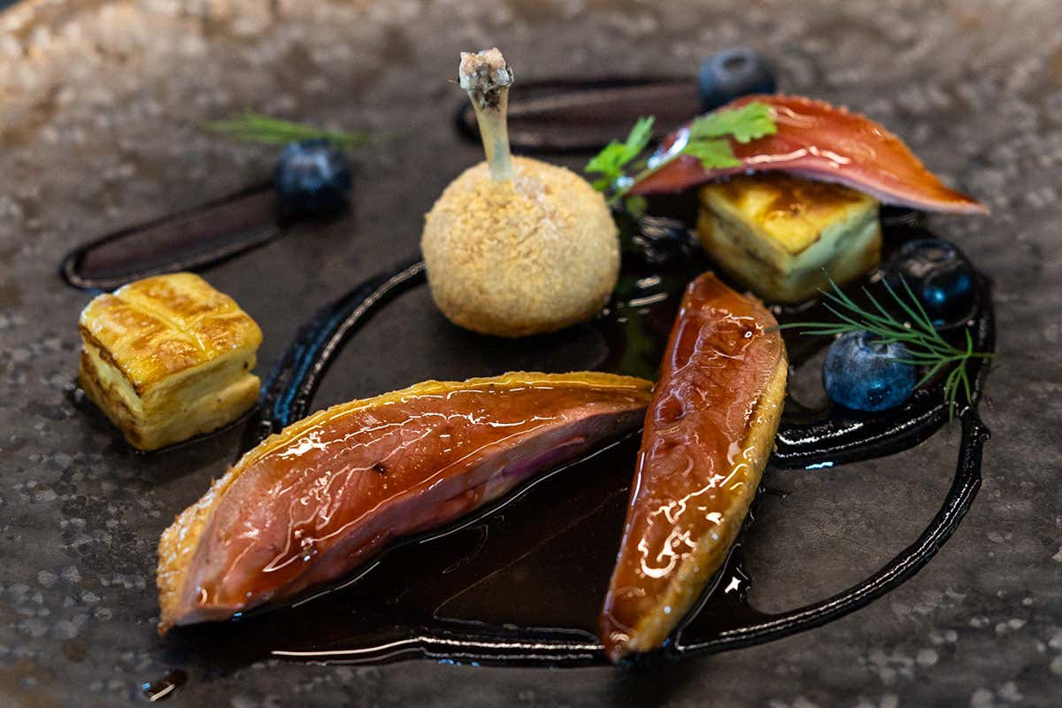 La ricetta si compone di tre varianti di mirtillo (fresco, spatolato in gel e in salsa ridotta) e diverse preparazioni del piccione: Il coscio, brasato e poi ricoperto da una pastella croccante di pangrattato; Il petto, servito in due porzioni e accompagnato da una salsa intensa ottenuta dalla carcassa dell’animale. «La caratteristica di questo piccione è una pillola di salute, secondo il mio parere», aggiunge Trovato. «Ha un gusto vellutato in bocca, quindi adatto a tutti i palati».