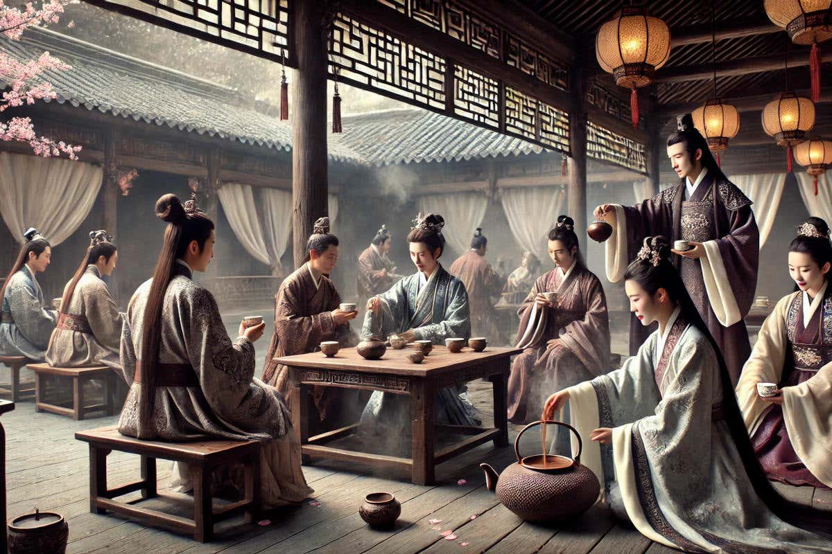I membri dell’aristocrazia gareggiavano nella preparazione del tè da e l’imperatore Huizong, passato alla storia per la sua raffinatezza e amore per l’arte, scrisse di proprio pugno un trattato sulla bevanda. In questo periodo, il tè iniziò a trovare estimatori anche fuori dei confini dell’Impero e divenne una delle principali merci esportate dalla Cina verso il Tibet e l’Asia centrale in cambio di destrieri necessari per equipaggiare la cavalleria imperiale.