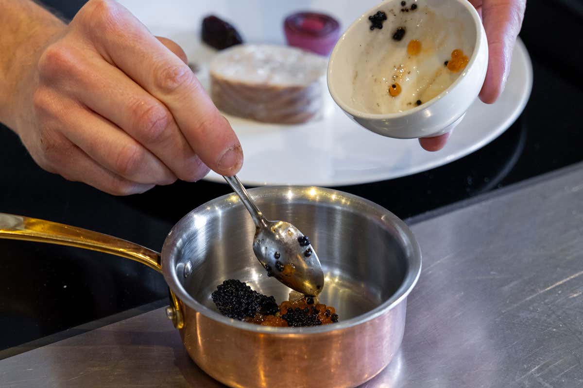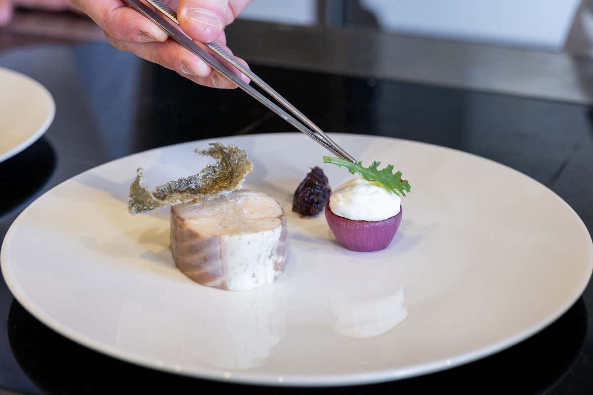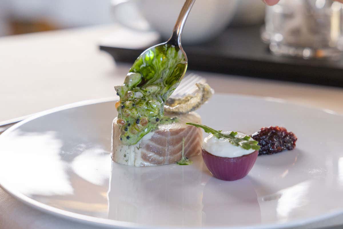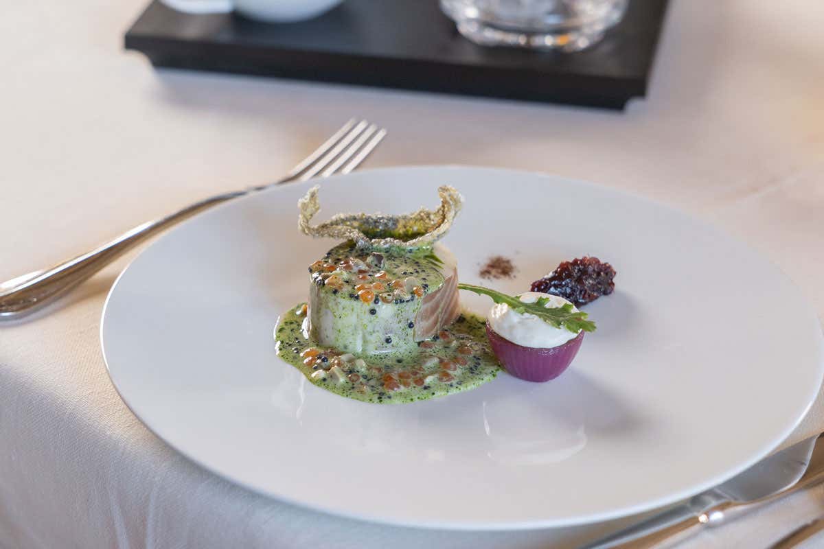 «La trota è cotta leggermente a vapore, ripiena con una mousse di trota e aneto, poi rifinita con una salsa di burro affumicato, uova di trota e olio all’aneto», spiega Campani. Un equilibrio delicato ma deciso, che parla la lingua del territorio.