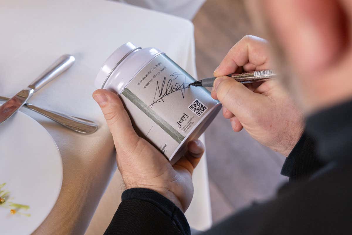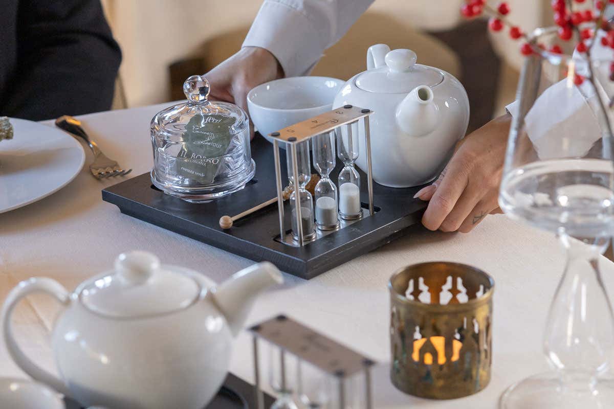 L’infusione è completata dall’aneto fresco coltivato all’Osteria del Borro, miscelato con altri due tè giapponesi per creare un profilo gustativo perfettamente in assonanza con il piatto. «Penso che questa miscela rappresenti bene un abbinamento in assonanza, non in contrapposizione. Il palato rimane fresco e pronto a proseguire l’esperienza», aggiunge Ferri.