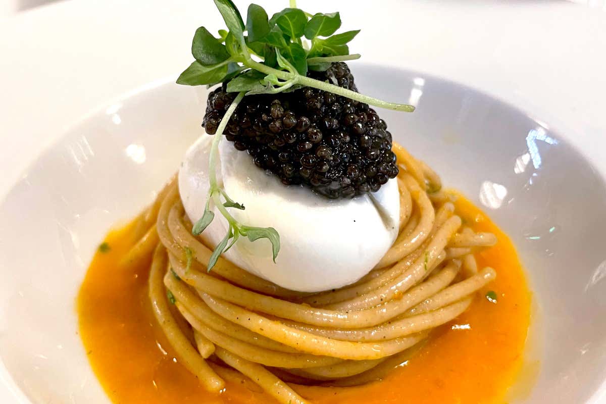 Spaghetto freddo con pomodoro giallo, burrata e caviale
