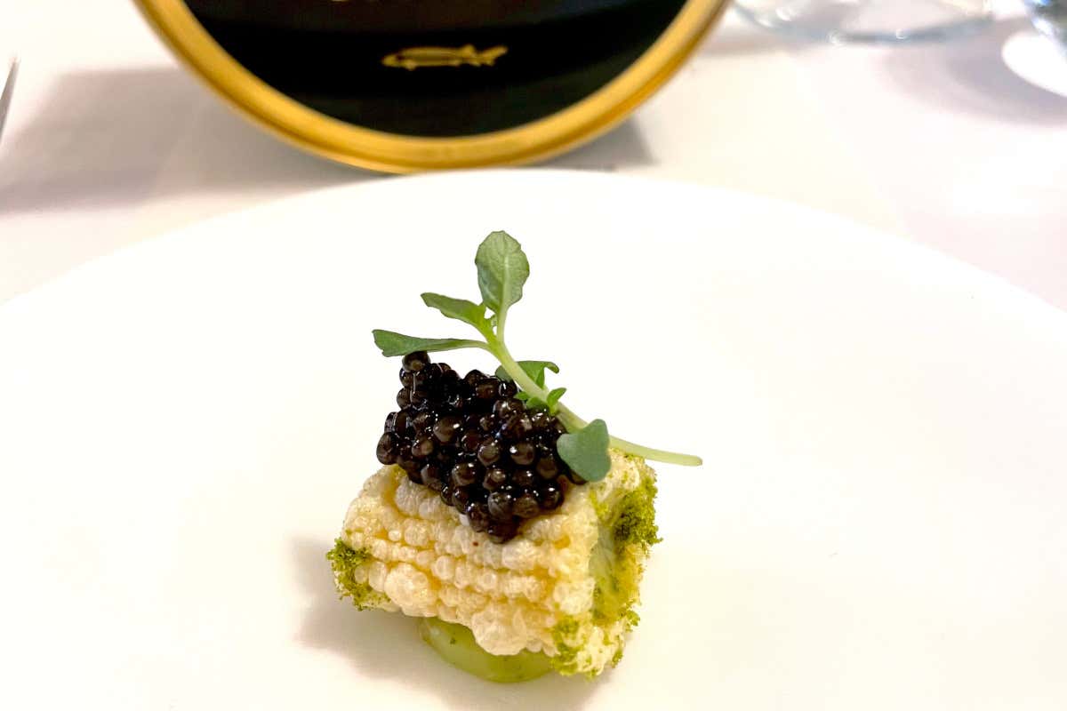 Di gusto particolarmente raffinato ed elegante, offre note burrose e aromi vicini al mondo della pasticceria ed è in grado di soddisfare ogni palato, dai neofiti fino agli esperti. La mano esperta e fantasiosa dello chef Roberto Conti ce lo ha somministrato fin dall’antipasto, costituito da salmone, carota, crème fraîche e caviale; a seguire uno spaghetto freddo con qualche eco Marchesiana (nel senso del Gualtiero), condito da pomodoro giallo, burrata e caviale.