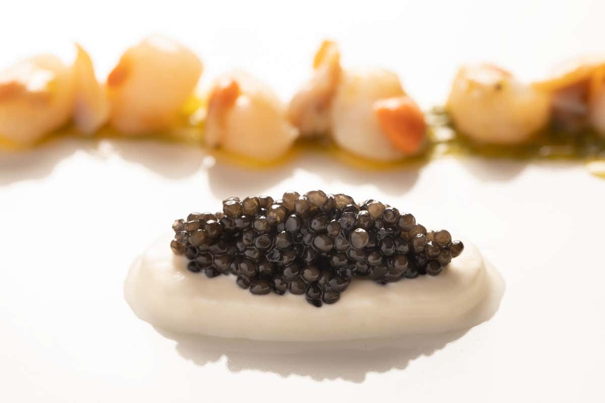 Caviale, vongole e canestrelli, su emulsione di prezzemolo e finocchio, crema al limone ricoperta di caviale Beluga Imperial, realizzata da chef Raffaele Ros