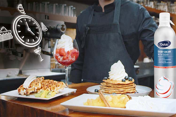 Le occasioni di consumo si dilatano lungo tutto l’arco della giornata. Infatti, è sempre l’ora di Panna Spray Debic e sono numerose le ricette consigliate. Il primo momento della giornata, la colazione, può essere l’occasione per il professionista di stupire i clienti unendo la versione zuccherata a un Pancake con frutti di bosco o ad una Crostatina alle mele. A pranzo, con la tipologia non zuccherata, si possono finire piatti salati esaltando ad esempio una Parmigiana di melanzane con polvere di pomodoro e parmigiano o una Tartare di manzo con crumble di pecorino.