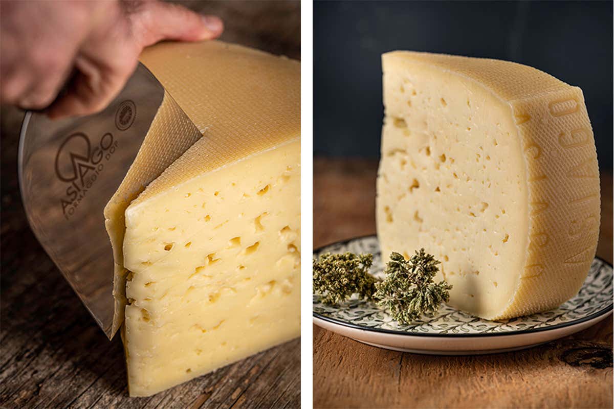 L’Asiago Dop è un formaggio a pasta semicotta prodotto esclusivamente con latte vaccino in due tipologie. La tipologia Asiago Pressato Dop, con latte intero, ha sapore dolce e delicato. L’area di produzione dell’Asiago Dop ricade nella provincia di Vicenza, in due zone confinanti delle province di Padova e Treviso e nella provincia di Trento. La stagionatura minima è di 20 giorni. Le forme di Asiago Pressato Dop, al termine della produzione, vengono sottoposte ad una pressatura effettuata con torchi manuali o idraulici. Da qui il nome! L’Asiago Pressato Dop ha crosta sottile ed elastica, pasta bianca o leggermente paglierina con occhiatura marcata e irregolare. Deve essere consumato entro circa dieci giorni dall’acquisto. Per costituire il tagliere si consiglia di porzionarlo a cubetti.