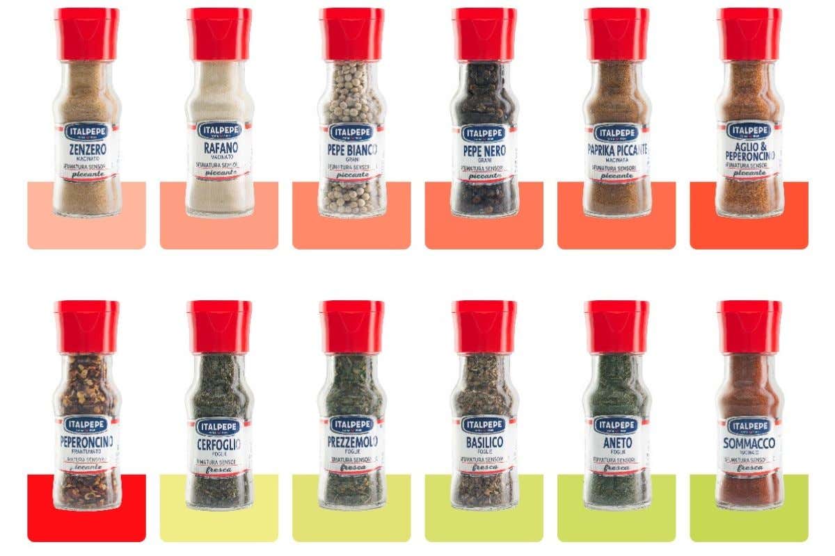 Classica (un mix di 93 sfumature sensoriali disponibili nel pratico flacone in vetro da 65 cc con inconfondibile “tappo rosso” Italpepe); Specialità dal Mondo (18 referenze relative ai pepi, curry e peperoncini selezionati direttamente dall’azienda nelle le migliori piantagioni al mondo), Macinini (selezione di spezie ed erbe aromatiche disponibili in un pratico flacone 65 cc dotato di un tappo macina); Sali (una selezione ampia di sali dal mondo, preziosi, unici e coloratissimi); Cocktail (cinque mix aromatici per Mojito, Spritz, Negroni, Hugo e Gin Tonic per ricreare nel cocktail una grande alchimia di sapori ed emozioni); Biologico (21 erbe aromatiche che rappresentano l’Italia nel mondo con le varietà più ricche dal punto di vista organolettico); Liofilizzati(ottenuti con un particolare processo di essiccazione che aumentala conservabilità del prodotto, preservando però le sue caratteristiche organolettiche e nutritive) e Spice Up – Fruit & Vegetable. Quest’ultima, presentata nel 2022, è una linea con 31 referenze che consente di portare ogni giorno in tavola, 365 giorni l’anno in modo smart e divertente, i cinque colori della salute. Il pratico formato rende questa gamma di prodotti un vero alleato dell’alimentazione, perché consente di portare sempre con sé e di tenere sempre in dispensa la giusta porzione della frutta e della verdura che più si apprezza.