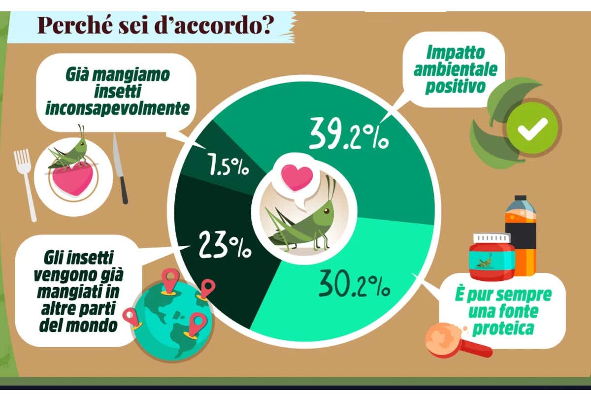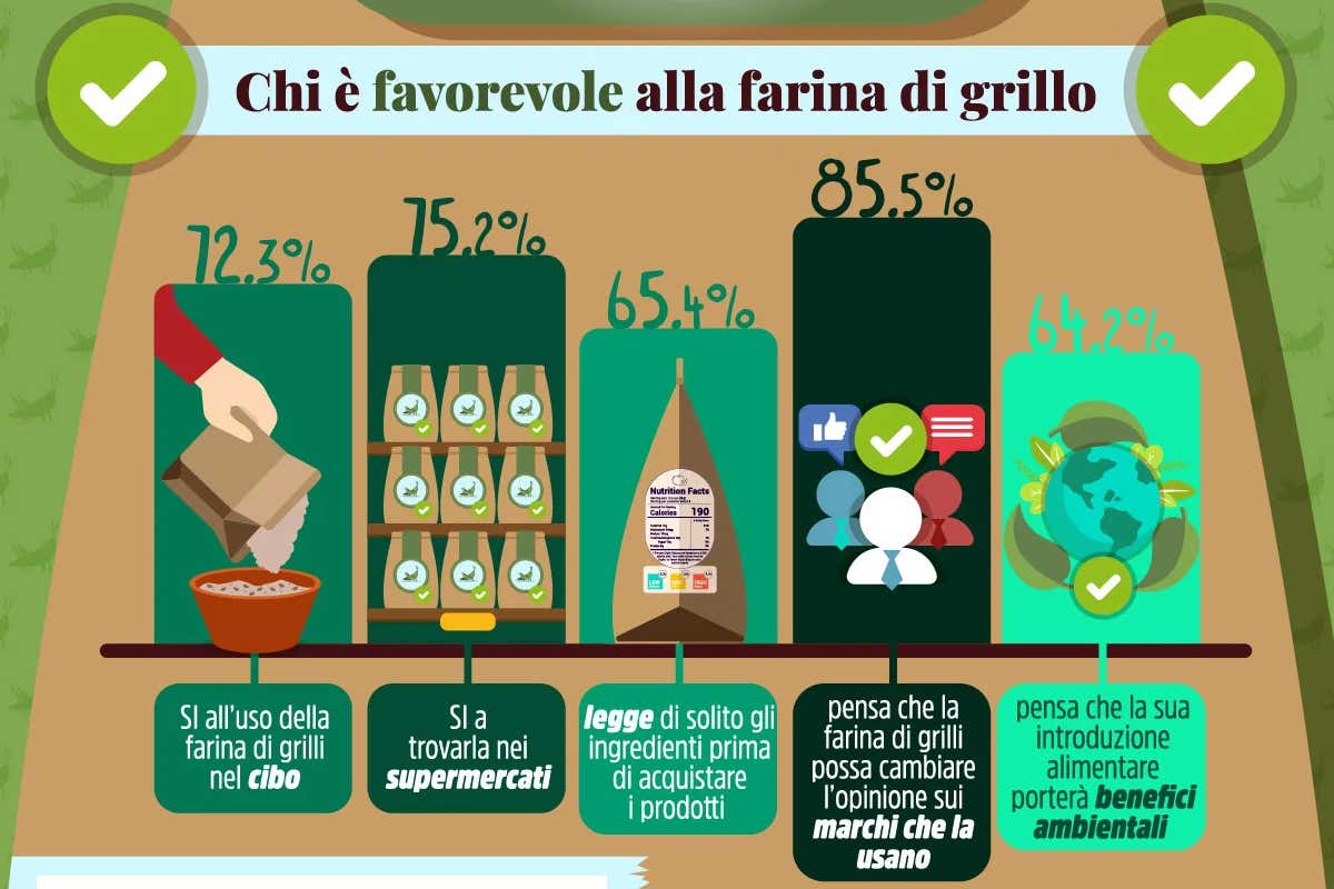 Tra i "pro" che hanno spinto verso questo risultato, non il desiderio di cucinare pane o piazza ai grilli, ma la sensibilità ambientale: per il 39,2%, seconda ragione la fonte proteica rappresentata da questo alimento (30.2%), seguita dal fatto che gli insetti vengano già mangiati in altre parti del mondo (23%), e dalla constatazione che mangiamo già insetti in modo inconsapevole (7.5%). Inoltre, il 64.2% del totale, sia favorevoli che contrari alla farina di grillo, pensano che la sua introduzione porterà benefici ambientali. L’85.5% del totale, tuttavia, pensa che la farina di grilli possa cambiare l’opinione delle persone sui marchi che la usano per la produzione alimentare.