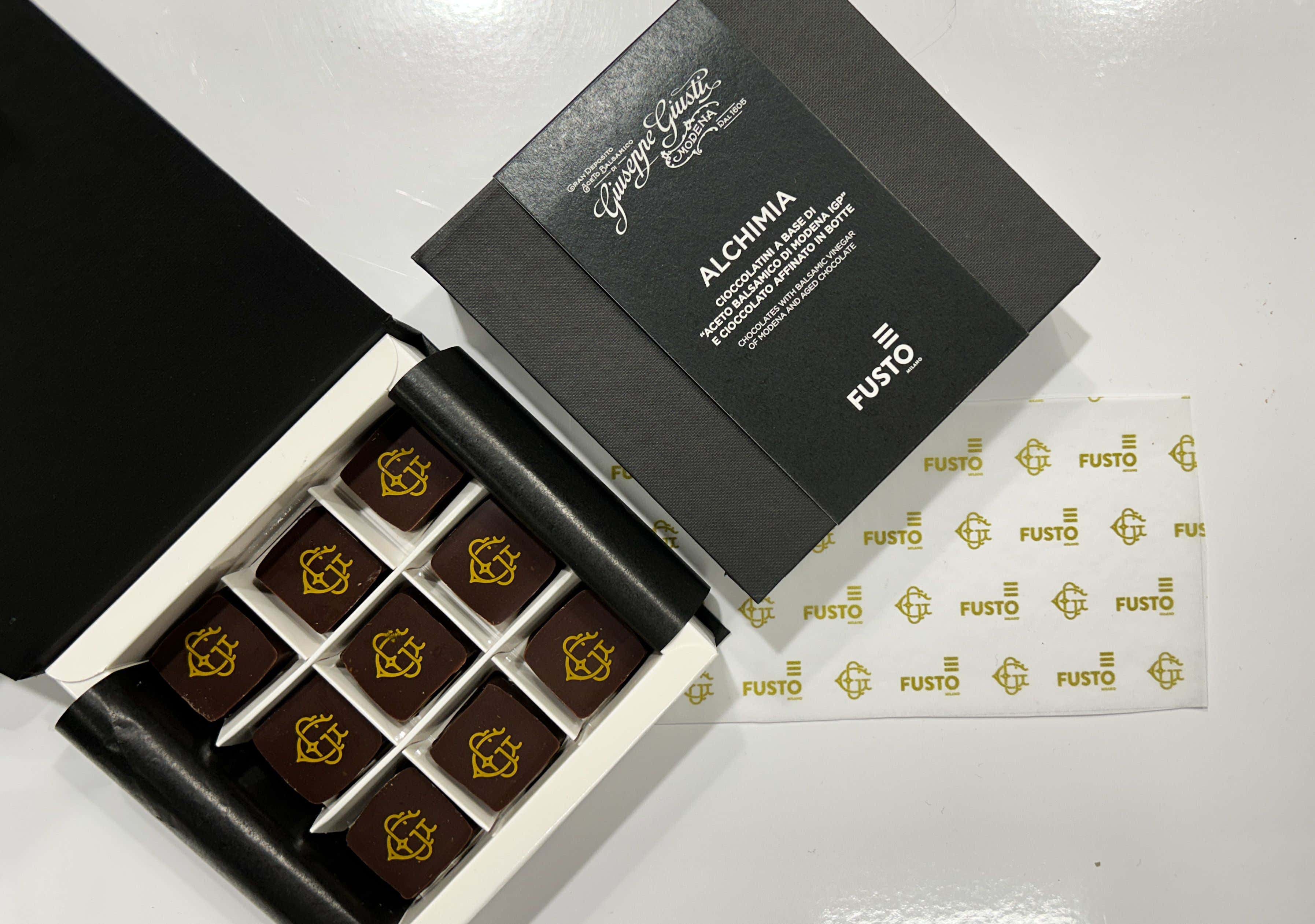 Con Alchimia Gianluca Fusto ha ideato un prodotto che in pochi grammi riesce a racchiudere sapori, aromi e profumi che raccontano e valorizzano una storia centenaria e allo stesso tempo rendono questo racconto attuale e innovativo, unendo le anime di due realtà – Acetaia Giusti e FUSTO Milano Cioccolato - dedite da sempre a promuovere l’eccellenza italiana. Claudio Stefani Giusti, AD di Acetaia Giusti, dichiara: «Alchimia è il risultato dell'incontro tra la nostra volontà di valorizzare l'Aceto Balsamico di Modena Giusti attraverso produzioni innovative e la genialità di Gianluca Fusto che ha colto la sfida realizzando un cioccolatino che, grazie alla fusione delle materie prime fin dall'origine, riesce a sprigionare un bouquet di profumi e sapori che ricorda pienamente quelli riscontrabili nelle nostre botti storiche di Aceto Balsamico».