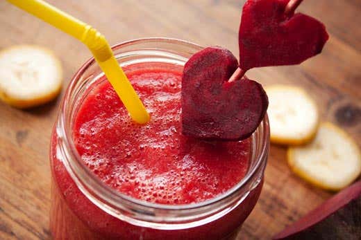 Preparazione: affetta le barbabietole, avendo cura di tenerne da parte 4 fette per la guarnizione. Unisci la banana, i lamponi, l’acqua di cocco e lo zenzero nel frullatore e agita fino a che non avrai ottenuto una morbida crema. Con una formina a forma di cuore ritaglia le restanti fette di barbabietola e mettile sugli spiedini di legno. Versare il frullato in bicchieri alti, aggiungi gli spiedini decorativi e il gioco è fatto!