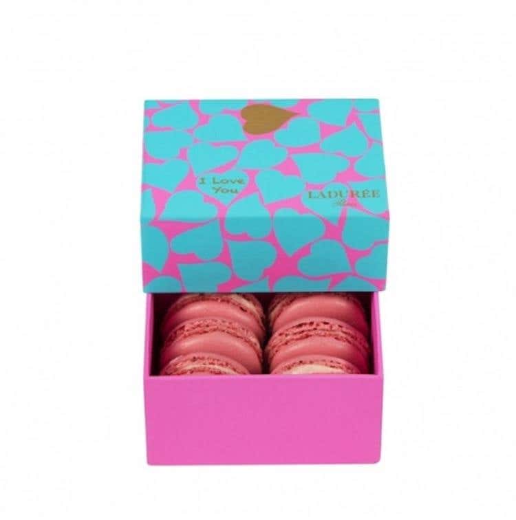 Ladurée i famosissimi macaron sono gelosamente custoditi in un’esclusiva scatola dai colori pastello con scritta oro “I love you” e i due dischetti di meringa racchiudono il nuovo gusto “Ciliegia Mandorla” un connubio perfetto tra la dolcezza della mandorle e la sensualità della ciliegia Morello.