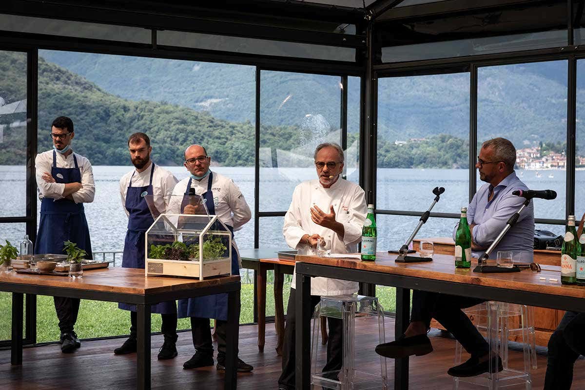 Una sensibilità ecologica che è necessario sia presente in ogni tassello dell’esperienza del visitatore. «Il senso di responsabilità deve essere presente anche ai primi anelli della catena produttiva - ha proseguito Marco Divià di Agricooltur - Per questo abbiamo sviluppato un brevetto per coltivare erbe e ortaggi attraverso un sistema aeroponico, in grado di ridurre del 98% l’utilizzo di acqua e fertilizzanti, fornendo ai ristoratori un prodotto che è mantenuto vivo durante tutta la filiera, dalla produzione al trasporto fino al momento del consumo grazie ai Micro e Macro Hortus, veri e propri orti dal design elegante e moderno che installiamo sia all’interno di ristoranti e bistrot che in città». Le piante di Agricooltur sono infatti quelle utilizzate per comporre Terra Madre, il nuovo piatto elaborato da chef Marco Sacco e dalla sua brigata. Con i suoi 66 ingredienti, per la maggior parte vegetali del sottosuolo ed erbette vive, Terra Madre è l’espressione massima della volontà di riappropriarsi della terra in accordo con i ritmi e i tempi della natura, un principio da sempre nella filosofia di Gente di lago e di fiume e che, a seguito del lockdown, viene perseguito con ancora più forza e convinzione.
