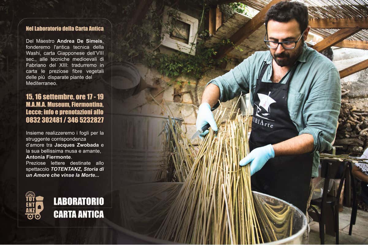 Eccezionalmente, per l’evento organizzato al Mama Museum sarà pubblicata una selezione della struggente corrispondenza amorosa tra Zwobada e Antonia, stampata su fogli realizzati durante due laboratori della Carta Antica, che il maestro cartaio terrà il 15 e 16 settembre per gli ospiti de La Fiermontina e Palazzo Bozzi Corso, le due dimore che insieme al Mama fanno parte de La Fiermontina Family Collection, ma saranno aperti anche a chiunque vorrà partecipare (previa prenotazione al n. 0832302481 – cell. 3465232827 e a raggiungimento dei posti disponibili, al costo di 25 euro a laboratorio). Il corso si articola in vari passaggi e non richiede alcuna esperienza manuale. Si esplora la tradizione orientale della washi giapponese del IX sec. e quella Occidentale delle gualchiere medioevali, si assiste alle fasi successive del raccolto: selezione delle fibre vegetali, follatura, lisciviazione e setacciatura della pasta di cellulosa, pescaggio delle fibrille nel tino d’acqua colorato e profumato, stiacciatura e asciugatura dei fogli.