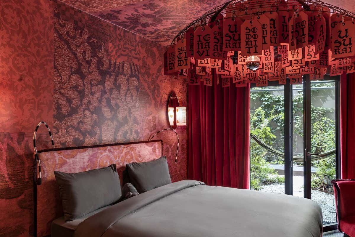 Ognuna delle 171 camere, è caratterizzata dal nome di un dannato o di un eletto e una breve spiegazione del personaggio. I corridoi che portano alle camere sono un preludio alla destinazione: azzurri quelli per il Paradiso, grigi, con porte rosso fuoco, quelli per l’Inferno. Quando si attraversano, si accendono luci soffuse e un sonoro con i versi della Divina Commedia. I colori dominanti sono il rosso dell’inferno, il bianco del paradiso e il verde, quello della vegetazione dei giardini e quello, declinato in diverse sfumature, scelto per rivestire arredi, complementi e oggetti.