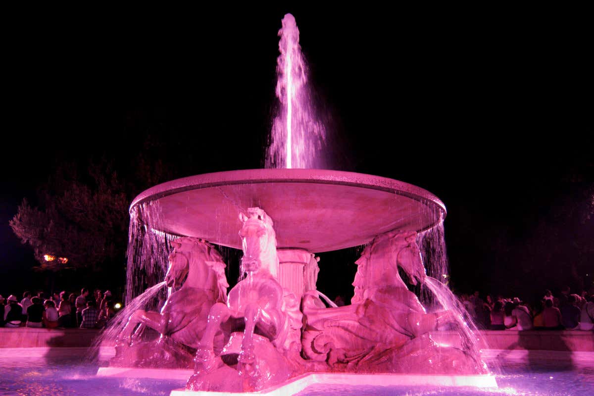 Una fontana illuminata di rosa per la Notte Rosa
