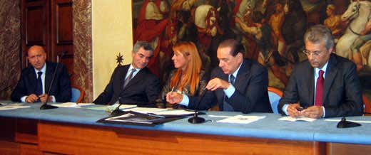 Nella foto sotto, da sinistra: Andrea Stolfa (Alitalia), Mauro Moretti (Ferrovie dello Stato), Michela Vittoria Brambilla, Silvio Berlusconi, Giovanni Chiodi (presidente Regione Abruzzo)