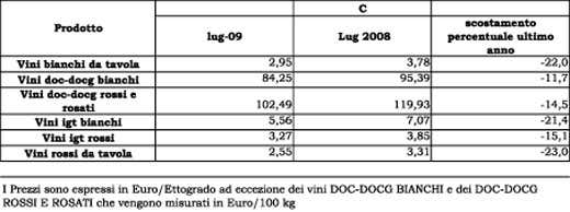 La produzione della vendemmia 2009, in Italia, dovrebbe toccare i 47 milioni di ettolitri e garantire un buon livello qualitativo su tutto il territorio nazionale. A questi dati positivi, però si contrappone una situazione di mercato nel segno di una crisi preoccupante. L'analisi dei listini vinicoli fatta da Confagricoltura nell'ultima settimana di agosto e il luglio 2009 vede i prezzi arretrare su tutta la linea (picco negativo massimo per i vini Doc e Docg rossi e rosati a -2,8%). Ben più critici i risultati del raffronto tra luglio 2008 e lo stesso mese del 2009, dove i cali di quotazioni sono più accentuati (i rossi da tavola, hanno perso il 23%). I prezzi sono fortemente diminuiti rispetto allo scorso anno con un andamento leggermente più stabile, nell'ultimo mese, per i vini da tavola e Igt.