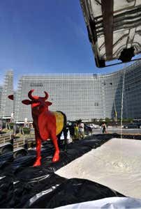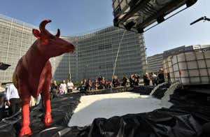 I produttori belgi e i rappresentanti European Milk Board (Emb) (per l'Italia l'associazione dei produttori della Pianura Padana), hanno creato un "lago" di latte nel cuore del quartiere europeo. In un telo di plastica di grande dimensione, circondato da balle di fieno, hanno riversato diverse migliaia di litri di latte raccolto ancora questa mattina nelle stalle belghe.