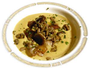 Preparazione :ammollare le Cicerchie in acqua per 24 ore, lessarle con gli odori, ripassarle in un soffritto di cipolle, carote, alloro e ridurle a crema. Servire con crostini avvolti in pancetta e funghi.