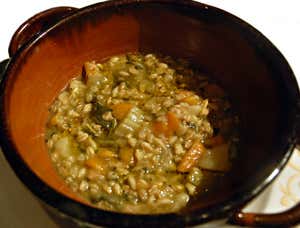 Ingredienti: farro, sedano, carote, cipolle, verza, patate, cavolo nero, altre verdure di stagione, brodo vegetale, sale, pepe