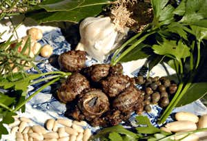 Preparazione: tritare finemente tutti gli aromi con i capperi, successivamente farli rosolare con 3 cucchiai di olio in una casseruola. Aggiungervi una manciata di pinoli, una di mandorle, un pizzico di sale e continuare la cottura fino a quando tutto non sarà ben rosolato. Quindi, unite le lumache, copritele con il vino bianco e lasciate cuocere a fiamma moderata. Servire le lumache ben calde con qualche fogliolina di prezzemolo.