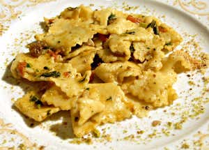 Ingredienti: farina, sale, pomodoro fresco, verdure fresche di stagione, pistacchi, uva passa, olio extravergine di oliva, mollica tostata, pancetta, tuma, finocchio selvatico, uova e pepe rosso