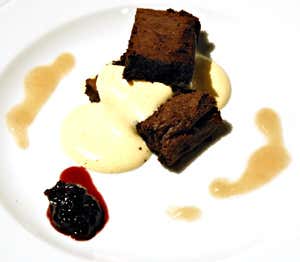 Preparazione: per la torta sciogliere il cioccolato con burro a bagnomaria, dividere i tuorli e gli albumi delle uova, montarli divisi con lo zucchero e unire il tutto delicatamente in un unico composto, aggiungere i cubetti di pera, distribuire in una teglia e infornare; la lievitazione viene data dall'ossigeno incorporato nell'uovo. Per la crema, montare i rossi d'uovo con lo zucchero, sciogliere il mascarpone ed aggiungere la panna montata. Per la riduzione ritirare a fuoco lento zucchero e Marsala.