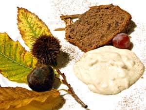 Ingredienti: strutto, uova, zucchero, farina, vino rosso, cacao amaro, cannella, chiodi di garofano, lievitante per dolci, cioccolato fondente, scorza di arancia grattugiata, castagne, miele di castagno, crema pasticcera, ricotta, rhum.