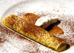 Preparazione: sbattere leggermente le uova con lo zucchero e in piccolo tegame fare delle sottili frittate. Condire la ricotta con lo zucchero e le scaglie di cioccolato. Farcire le frittatine ed arrotolarle, servirle con crema di cachi.