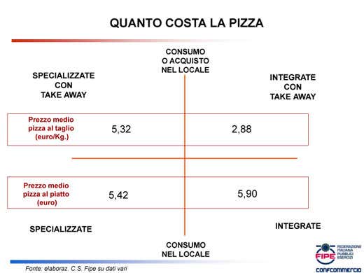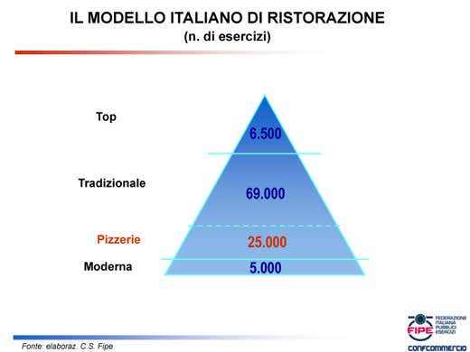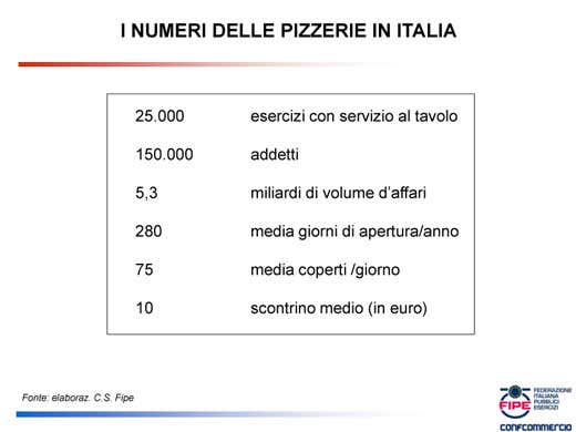 Tutti i numeri delle pizzerie italiane: è quanto la Fipe ha elaborato per redigere un quadro attuale e completo sul comparto che raccoglie 25.000 pizzerie, 150mila addetti e un volume d'affari annuo di 5,3 miliardi di euro.Dalla relazione emergono inoltre dati importanti, come dimostrano i grafici e le tabelle che riportiamo sotto: le pizzerie, numericamente, rappresentano circa il 25% degli esercizi a carattere ristorativo. Al fianco delle 25.000 pizzerie troviamo infatti 69.000 ristoranti tradizionali, 6.500 ristoranti top e 5.000 facenti capo alla categoria "moderna". A queste due ultime fasce è riservata la maggior fetta di fatturato in proporzione al numero di esercizi.La ricerca ci porta poi a scoprire numerosi dati significativi: dalla superficie media al numero di scontrini giornalieri oppure all'importo procapite speso in pizzeria. Ma quanto cosa la pizza? Secondo il sondaggio di Fipe si va dai 2,88 euro delle pizze al taglio vendute nelle gastronomie, rosticcerie e panetterie ai 5,90 euro delle pizze tradizionali (servite nel piatto) di pizzerie o pizza-disco. I conti sono presto fatti: in Italia si arrivano a sfornare così quasi 900 milioni di pizze.Articoli correlati:Metà delle pizze italiane preparate con ingredienti stranieriVittoria della pizza napoletana Sarà tutelata dall'EuropaSulla pizza è scontro aperto fra la Fipe e la Coldiretti Arriva la pizza 'Doc” firmata dagli agricoltori italiani Il decalogo della buona pizza No alle "pizze di latta" I pizzaioli protestano su Facebook I pizzaioli vogliono le scuse del Tg1 Altro che Dieta Mediterranea Il Tg1 calpesta anche la Pizza