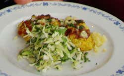 Mischiare il pane con la farina, versare il latte bollente, dorare la cipolle nel burro, aggiungere i porri, soffriggere tutto per un momento e aggiungere sul pane. Aggiungere anche gli ingredienti rimanenti tranne il Parmigiano, poi mescolare bene tutto, fare riposare l'impasto (e se l' impasto fosse troppo molle, aggiungere un po' di pangrattato). Formate poi canederli a forma di polpettine piatte e fateli rosolare nell'olio e burro a tutte due le parti. Cuocerli a vapore per circa 15 minuti. Preparateli su un piatto, mettete sopra un po' di parmigiano, erba cipolline, servire con burro fuso leggermente dorato, come contorno l'insalata di cappuccio.