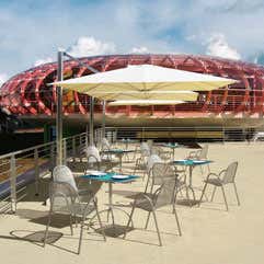 Dimentichiamoci il tradizionale ombrellone di una volta. I modelli a catalogo dei principali produttori sono belli, estetici, funzionali per garantire un riparo ottimale e poca invasività permettendo di sfruttare al massimo gli spazi senza creare vincoli alla circolazione e al posizionamento di sedute e tavoli. Generalmente la piantana centrale è quasi sempre sostituita dalle versioni con il palo laterale, molto comoda da posizionare; c'è poi una zavorrata adeguata alla base necessaria per garantire la stabilità. L'ombrellone può ruotare e offrire una copertura a 360°, spesso tramite semplici comandi ad argano. Per aree di grandi dimensioni esistono modelli a doppia o quadrupla copertura. La struttura può essere in legno per esterni (tek trattato) in metallo verniciato o zincato per assicurare la protezione da agenti atmosferici. Tra i vantaggi di una scelta del genere c'è certamente la libertà di posizionamento, la facilità di montaggio e rimessaggio durante l'inverno, l'orientamento. Certo, però, rimane la variabile vento, che è il nemico numero uno degli ombrelloni. Ma anche qui c'è una soluzione: numerosi modelli sono dotati di valvola per lo sfogo del vento, ma nel momento in cui è molto forte l'ombrellone deve essere chiuso per sicurezza.