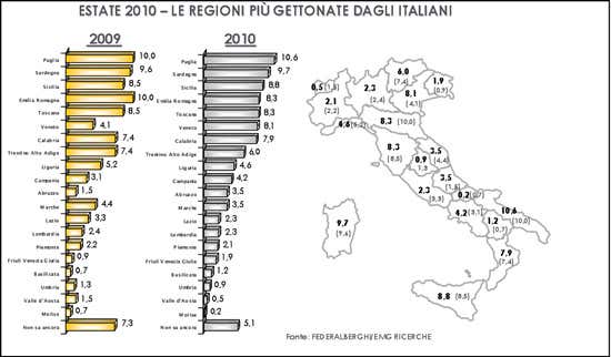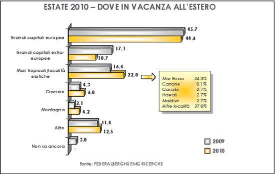 Il 70,3% di italiani ha scelto o sta scegliendo l'Italia per le proprie vacanze estive e l'estero è scelto invece dal 27,3%. Per chi va all'estero le grandi Capitali europee fungono ancora da elemento catalizzatore con il 44,6% della domanda (rispetto al 45,7% del 2009).