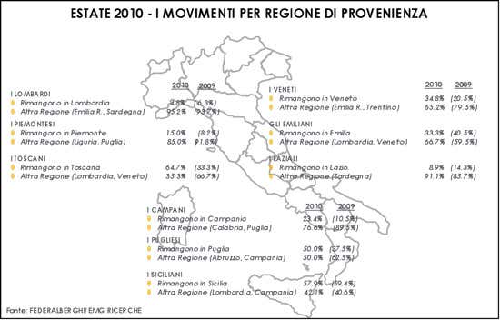 PUGLIESI – In perfetta parità è invece la quota dei pugliesi che per il 50% (rispetto al 37,5% del 2009) rimangono in ambito regionale, mentre il restante 50% (rispetto al 62,5% del 2009) parte in direzione soprattutto dell'Abruzzo e della Campania.