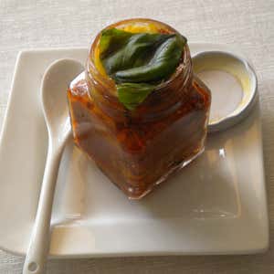 Preparazione: Togliere la buccia alle melanzane e tagliarle a fette. Far perdere l'acqua in eccesso tenendole in forno statico a 160°C per circa 5 minuti. In un barattolo di vetro versare una cucchiaiata di passata di pomodoro, poi alternare fette di melanzane a pomodoro, mozzarella e basilico e insaporire con sale e olio extravergine d'oliva. Terminati gli strati, chiudere il barattolo e cuocere a vapore per tre ore a 80°C. Aprire il barattolo, gratinare la superficie e servire la parmigiana a vapore calda.