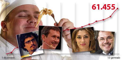 Il sondaggio 'Premio Italia a Tavola - Personaggio dell'anno dell'enogastronomia e della ristorazione 2010”, realizzato da 'Italia a Tavola” con la collaborazione di Oliovinopeperoncino e Consultazienda, si avvia verso la conclusione. Allo scoccare della mezzanotte di domenica 16 gennaio si chiuderanno le operazioni di voto, decretando così i due vincitori, uno per categoria. Al momento il numero dei votanti ha raggiunto i 61.455, ma si tratta di una cifra che cresce a vista d'occhio. Anche esagerando nei pronostici, non avremmo mai immaginato di poter ottenere un così ampio riscontro. Evidentemente i candidati sentono l'approssimarsi del termine e stanno risollecitando, soprattutto servendosi della rete, fan e sostenitori affinché continuino a votarli. In effetti la classifica è ancora in movimento: tutto può ancora accadere...