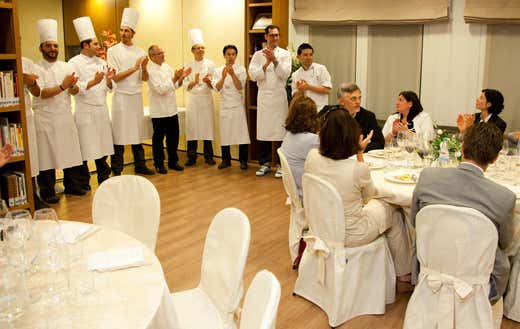 Nella foto, da sinistra: Rosario Scarpato (Itchefs-Gvci managing editor), Luigi Passano, Pietro Rongoni, Cesare Casella, Yoshi Yamada, Domenico Crolla, Angela Hartnett, Mario Caramella (presidente Itchefs-Gvci), Paolo Monti e Gianluigi Zenti (direttore di Academia Barilla). In primo piano, inginocchiati: Giulio Vierci, Donato De Santis e Mark Ladner