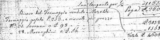Il motivo dell'affermazione del nome "Branzi" è evidente: per tutto l"Ottocento il "Branzi" dal punto di vista commerciale (quantità) ha prevalso sul Bitto. Il prodotto perveniva a Branzi (o "ai Branzi", come si diceva un tempo) da un"area abbastanza vasta (quindi abbastanza eterogenea) ed era ovvio l"interesse, per garantire un'identificazione univoca e sostenere la reputazione merceologica richiamare il punto di convergenza commerciale. Come dicevamo, però, il "Branzi" era prodotto anche nelle valli del Bitto, anche nella culla della Valgerola. Le prove storiche sono schiaccianti. Alcuni dei documenti storici più interessanti sulla gestione dell"alpeggio nelle Valli del Bitto sono costituiti dai registri d"alpeggio di Orlando Curtoni (1676-1761) e dei figli Antonio e Gerolamo cistoditi persso l"Archivio parrocchiale di Gerola ed esaminati dall'amico Cirillo Curtoni. I Curtoni caricavano l'Alpe Pescegallo Lago di Gerola. Nei registri del padre si indica la presenza di sue soci caricatori di Cusio in alta Val Brembana (di parentela Rovelli), il formaggio era venduto a Cusio e tra le spese figurava l'acquisto dello zafferano. Tutto il prodotto venduto in Bergamasca era colorato con zafferano (una tradizione che è rimasta viva nel caso del Bagoss e che nel Bitto/Branzi si è persa nel corso del 900). Begamo apparteneva alla Repubblica di Venezia, terminale del mercato delle spezie. Da Venezia, tramite Bergamo e la Via Priúla, lo zafferano saliva sin sugli alpeggi di qui e di là del Passo di S.Marco. Anche i figli di Orlando Curtoni hanno venduto il Branzi/Bitto in val Brembana (sono citate vendite a commercianti di Averara e di Cusio a volte con consegne alla Casera di S. Marco (sull'autostrada - per i tempi - della Via Priúla). Negli anni più recenti (i registri arriviano al 1800) le vendite a commercianti di Como si intensificano. Ancora nel 1844 il formaggio dell"alpe Pescegallo Lago, però, risulta venduto sempre in alta val Brembana, a Mezzoldo (vedi riproduzione del documento sotto) come si ricava dal registo della ripartizione di spese e ricavi tra i tre soci caricatori: Bartolomeo Acquistapace , Antonio Curtoni e Ambrosetti Giovanbattista. Tra le spese figura sempre lo zafferano. Ergo si produceva quello che poi è divenuto noto come "Branzi".