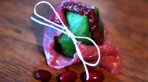 Tagliare in due il fico e farcirlo con un composto omogeneo di timo, limone e ricotta di bufala (o robiola). Infornarlo per una decina di minuti a 180°C quindi estrarlo e aggiungere la mostarda di corniola bella fresca. Rinchiudere bene il fico nella carne salata e servirla subito a tavola. Il calore del fico tenderà a cuocere la carne salata che insieme alla dolcezza della corniola e la morbidezza del formaggio si completeranno al gusto.