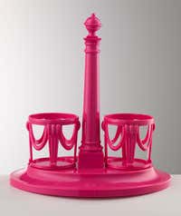Sorprendente l'oliera Susy in acrilico. Allegra e formale al tempo stesso è declinata nei colori trasparente, verde, rosso, fumè, smalto bianco e nelle accese tinte flou arancio e fucsia (nella foto a sinistra).